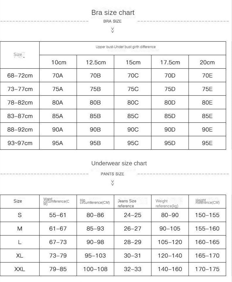 - Sizes: 70A-70D, 75A-75D, 80A-80D, 85B-85D (with corresponding S, M, L, XL underwear and garter)