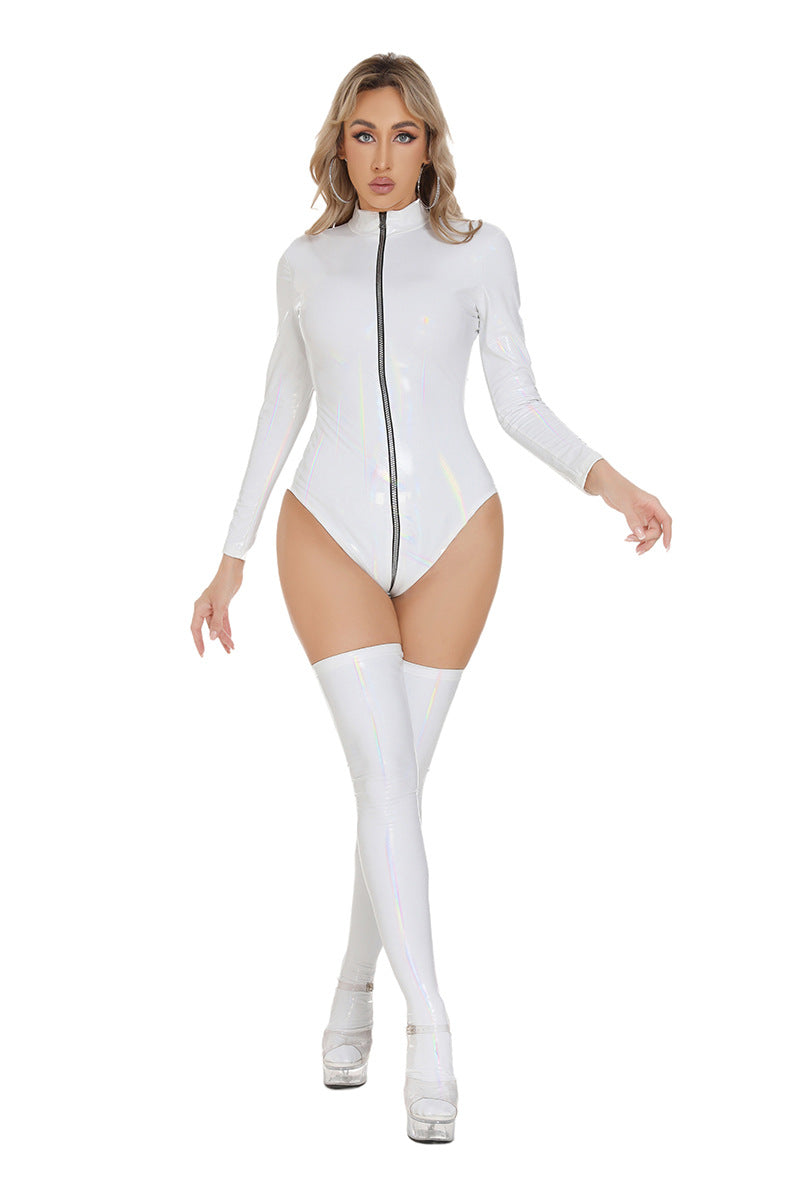 Feel daring, bold, and irresistibly confident in this colorful bright zipper open crotch PU leather lingerie.